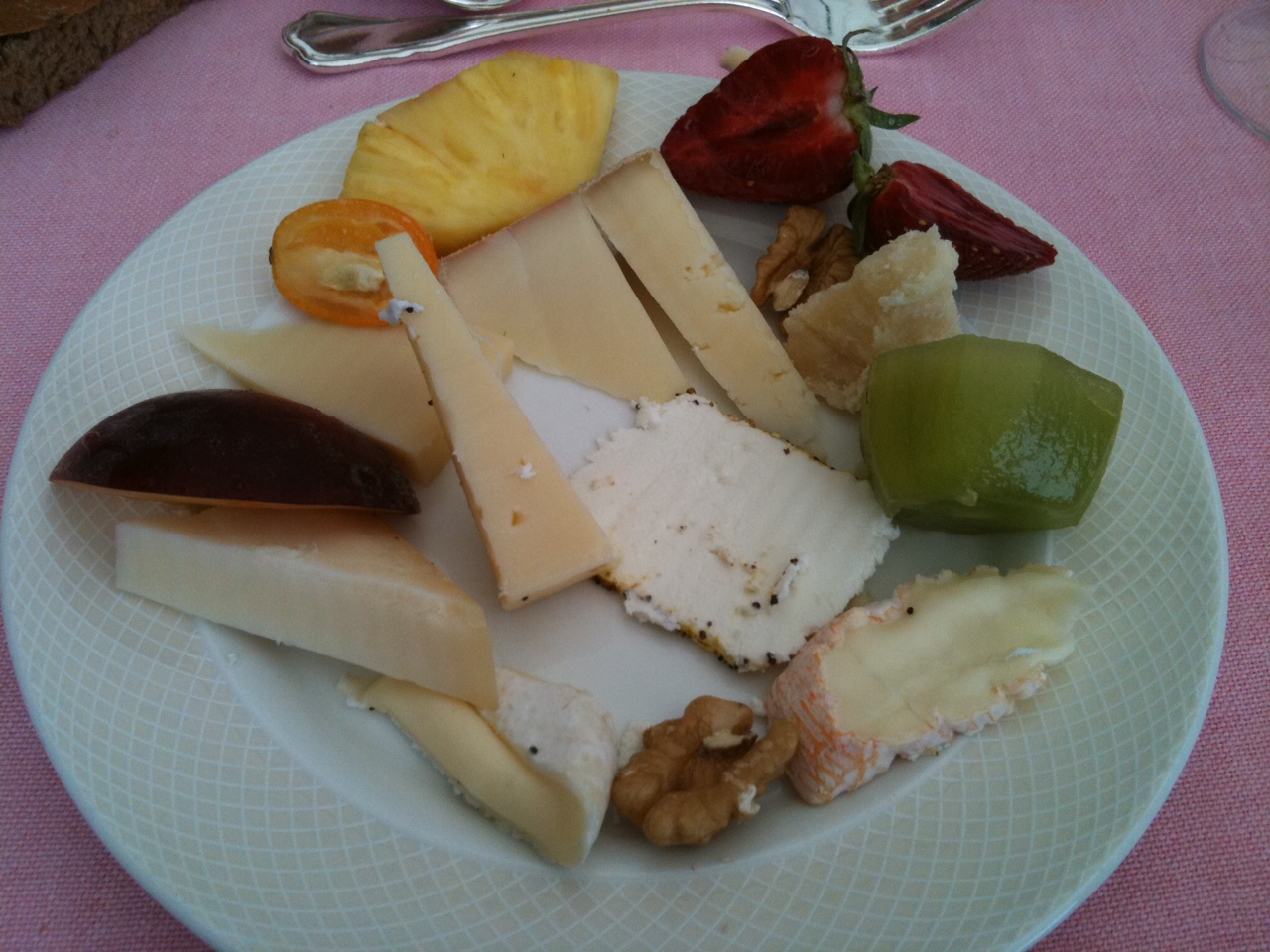 - Frisches Obst: Weintrauben, Apfelspalten, Birnenspalten, geviertelte Feigen, Physalis, Erdbeeren, Himbeeren